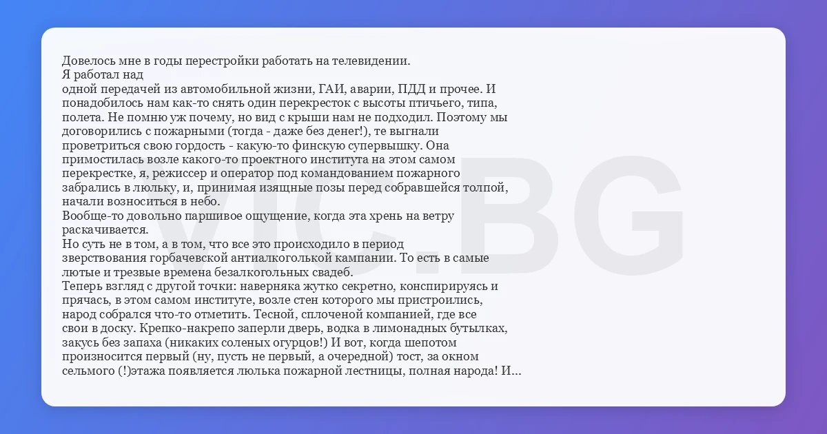 Довелось мне в годы перестройки работать на телевидении. Я работал над одной передачей из автомобильной жизни, ГАИ, аварии, ПДД и прочее. И понадобилось нам как-то снять один перекресток с высоты птичьего, типа, полета. Не помню уж почему, но вид с крыши нам не подходил. Поэтому мы договорились с пожарными (тогда - даже без денег!), те выгнали проветриться свою гордость - какую-то финскую супервышку. Она примостилась возле какого-то проектного института на этом самом перекрестке, я, режиссер и оператор под командованием пожарного забрались в люльку, и, принимая изящные позы перед собравшейся толпой, начали возноситься в небо. Вообще-то довольно паршивое ощущение, когда эта хрень на ветру раскачивается. Но суть не в том, а в том, что все это происходило в период зверствования горбачевской антиалкоголькой кампании. То есть в самые лютые и трезвые времена безалкогольных свадеб. Теперь взгляд с другой точки: наверняка жутко секретно, конспирируясь и прячась, в этом самом институте, возле стен которого мы пристроились, народ собрался что-то отметить. Тесной, сплоченой компанией, где все свои в доску. Крепко-накрепо заперли дверь, водка в лимонадных бутылках, закусь без запаха (никаких соленых огурцов!) И вот, когда шепотом произносится первый (ну, пусть не первый, а очередной) тост, за окном сельмого (!)этажа появляется люлька пожарной лестницы, полная народа! И не просто народа! А с видеокамерой, готовой безжалостно запечатлеть все происходящее! Жалюзи в те времена не было и в помине - застигнутые врасплох антиобщественные пьяницы так и замерли со стаканами в руках. Мы тоже уставились на их, раскачиваясь за окном на ветру. И только оператор вскинул камеру и стал снимать "пьянство на рабочем месте". Мирные отмечавшие не выдержали, и начали спасаться бегством, натягивая снятые было пиджаки, и прячась под столами. А режиссер за окном все пританцовывал в люльке, хлопал оператора по спине и в восторге кричал "Снимай их, Вовка! Снимай, блядюг!" Интересно, как эти участники фантастически неудачной пьянки потом вычисляли "стукача", который навел?!