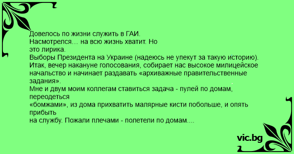 Довелось по жизни служить в ГАИ. Насмотрелся… на всю жизнь хватит. Но это лирика. Выборы Президента на Украине (надеюсь не упекут за такую историю). Итак, вечер накануне голосования, собирает нас высокое милицейское начальство и начинает раздавать «архиважные правительственные задания». Мне и двум моим коллегам ставиться задача - пулей по домам, переодеться «бомжами», из дома прихватить малярные кисти побольше, и опять прибыть на службу. Пожали плечами - полетели по домам. Когда вернулись: во дворе ГАИ стоят новенькие сверкающие девятки с забрызгаными грязью номерами - картинка! Все салоны задрапированы полиэтиленовой пленкой, рядом с машинами по две БОЛЬШУЩИЕ банки эмалевой краски и такие же «бомжы» в полном недоумении. Начальство вручает нам ключи от машин и ставит уже конкретные задачи: на всех заборах города конкурентов нещадно замазывать, а рисовать лозунги типа «Кучма - наш рулевой! ». Кроме того охранять общественный порядок на территории в виде доставления всех, кто поздней ночью будет неправительственную живопись выводить на заборах, в ближайшее отделение милиции. А для личной безопасности получить табельное оружие в виде пистолетов ПМ каждому, и АКСУ на экипаж! И вот отряд «бомжей», вооруженный до зубов, с малярными кистями наперевес, численностью с примерно роту, тихо и незаметно растекается на новеньких авто по сонному городу. Нам достался участок от выезда из города до аэропорта. Заборов - многие километры! Покрасили один заборчик, закрасили другой, покурили, тихо «шинами шурша» катим дальше. Стоп, а это что за бригада юных хиппи сводит на нет нашу работу?! Пистолеты, автоматы и малярные кисти наголо! Всем стоять? бояться! Руки в гору, от забора! Документы! Тут как в «Место встречи изменить нельзя»: «Документы? Это можно…» и хиппи в момент ощетинились воронеными стволами (мне показалось даже гранатометом). Еще б 5 минут - и разгорелся бы жаркий бой за заборы родного города! Но нашлась хоть одна умная голова с той стороны, которая кроме ствола ощетинилась еще и служебным удостоверением и стала во всю глотку орать: «Стоять, руки на капот! Вас приветствует Служба Безопасности Украины! ». Здрасссте, приехали! Оказывается одно большооое дело делаем! Посмеялись, пожали руки, разделили территорию, катим дальше. Ба, опять группа со скорбными лицами и малярными принадлежностями. Из соображений безопасности теперь выхватываем только служебные удостоверения и кисти. - Кто такие? , - спрашиваем. - А не пойти ли вам туда, куда Макар телят не гонял, и не мешать людям выполнять свой служебный долг?. - Ах, так! - тогда пистолеты наголо, АКСУ на боевой взвод! Скорбные лица покрылись чернотой от неожиданного миража в виде "бомжей" с автоматическим оружием. - Ребята, да мы пожарные! - Документы! Ни документов, ни (слава богу!) оружия. Ну тогда в отделение. Разобрались - точно: бедные пожарные. Без документов, без оружия, без автомобиля, зато с одноколесной тачкой! Этой ночью мы еще встречали на вверенной нам территории таможенников, пограничников, военных и т. д. А мы боялись, что краски не хватит на такие километры заборов!