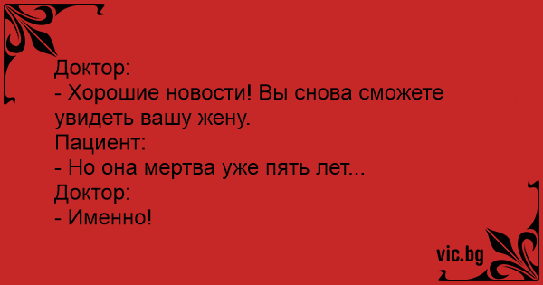 Доктор:<br />- Хорошие новости! Вы снова сможете увидеть вашу жену.<br />Пациент:<br />- Но она мертва уже пять лет...<br />Доктор:<br />- Именно!