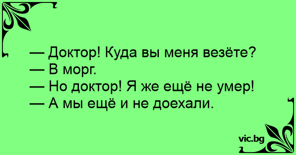 Greitosios pagalbos mašinoje pacijentas klausia: - Kur mane vežat? - Į morgą. - Bet aš dar nenumiriau? - O, mes dar neatvažiavom.