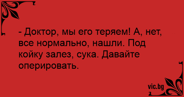 - Доктор, мы его теряем! А, нет, все нормально, нашли. Под койку залез, cуka. Давайте оперировать.