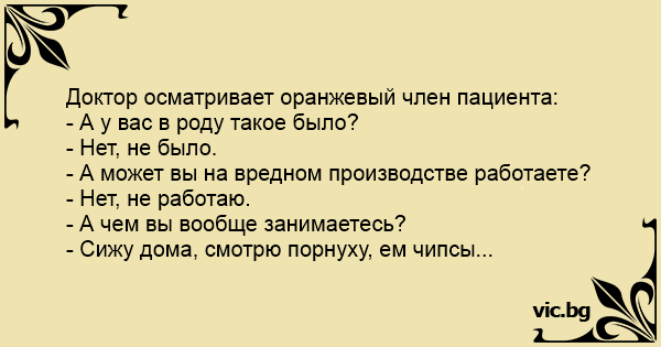 En mann går til legen og forteller at penisen har blitt oransje. Doktoren ser på den, og sier: "Jeg har aldri sett noe lignende før i hele min medisinske karriere. Hva jobber du med? Jobber du med...