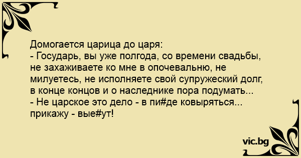 Домогается царица до царя: - Государь, вы уже полгода, со времени свадьбы, не захаживаете ко мне в опочевальню, не милуетесь, не исполняете свой супружеский долг, в конце концов и о наследнике пора подумать... - Не царское это дело - в пи#де ковыряться... прикажу - вые#ут!
