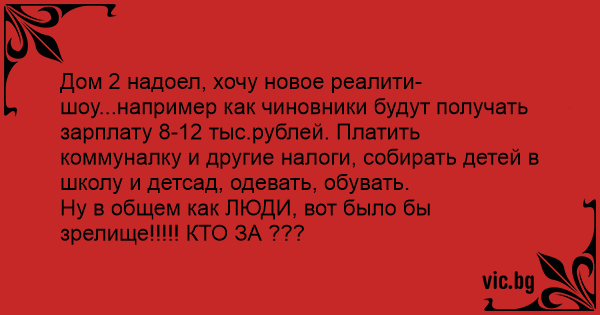Дом 2 надоел, хочу новое реалити- шоу...например как чиновники будут получать зарплату 8-12 тыс.рублей. Платить коммуналку и другие налоги, собирать детей в школу и детсад, одевать, обувать.