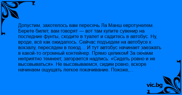Допустим, захотелось вам пересечь Ла Манш евротунелем. Берете билет, вам говорят ― вот там купите сувенир на последние фунты, сходите в туалет и садитесь в автобус. Ну, вроде, всё как ожидалось. Сейчас подъедем на автобусе к вокзалу, пересядем в поезд… И тут автобус начинает заезжать в какой-то огромный контейнер. Прямо целиком! За окнами неприятно темнеет, загорается надпись: «Сидеть ровно и не высовываться». Не высовываемся, сидим ровно, вскоре начинаем ощущать легкое покачивание. Похоже, понеслась. Минут через пятнадцать покачивания в темноте непонятно как приходит смс от телефонного оператора: «Приветствуем вас во Франции!». Какая еще Франция? Да вы под толщей воды, где туннель, а в туннеле контейнер, а в контейнере автобус, а в автобусе кресло, а в кресле ― вы. Не хватает только яйца да иголки. ©