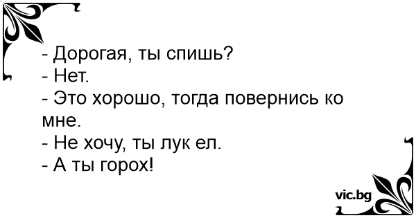 - Люба, ти спиш? - Ні. - Це добре, тоді повернись до мене. - Не хочу, ти цибулю їв. - А ти горох!