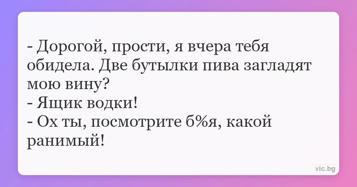 - Дорогой, прости, я вчера тебя обидела. Две бутылки пива загладят мою вину?<br />- Ящик водки!<br />- Ох ты, посмотрите б%я, какой ранимый!
