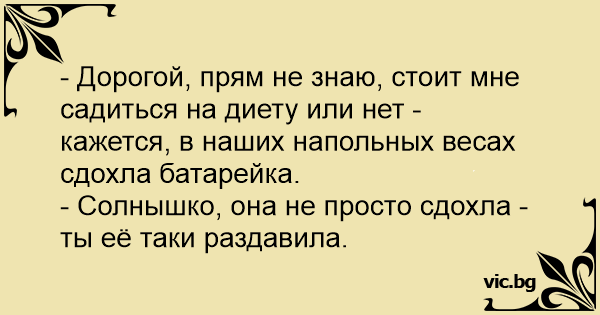 - Дорогой, прям не знаю, стоит мне садиться на диету или нет - кажется, в наших напольных весах сдохла батарейка.