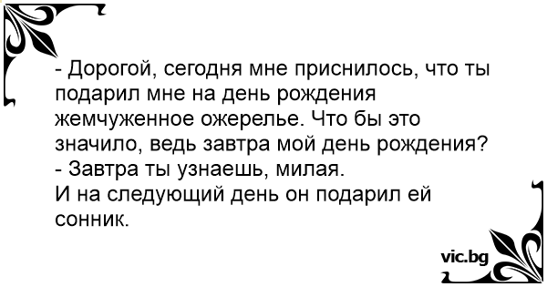 - Дорогой, сегодня мне приснилось, что ты подарил мне на день рождения жемчуженное ожерелье. Что бы это значило, ведь завтра мой день рождения?