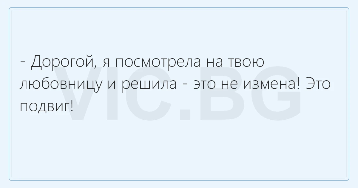 - Дорогой, я посмотрела на твою любовницу и решила - это не измена! Это подвиг!