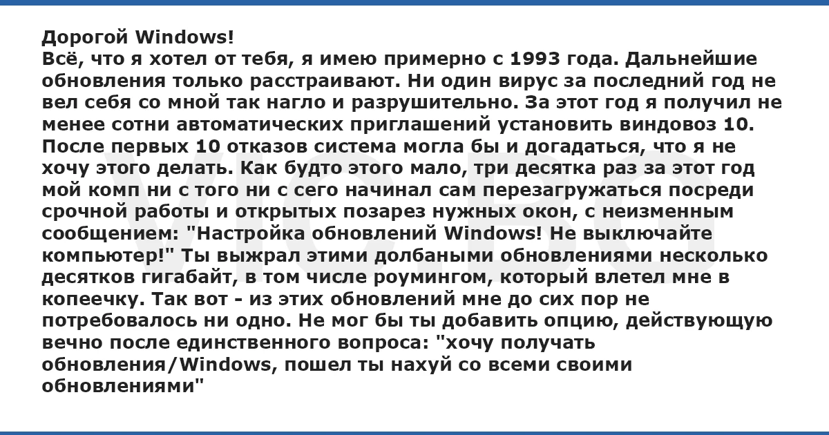 Дорогой Windows! Всё, что я хотел от тебя, я имею примерно с 1993 года. Дальнейшие обновления только расстраивают. Ни один вирус за последний год не вел себя со мной так нагло и разрушительно. За этот год я получил не менее сотни автоматических приглашений установить виндовоз 10. После первых 10 отказов система могла бы и догадаться, что я не хочу этого делать. Как будто этого мало, три десятка раз за этот год мой комп ни с того ни с сего начинал сам перезагружаться посреди срочной работы и открытых позарез нужных окон, с неизменным сообщением: "Настройка обновлений Windows! Не выключайте компьютер!" Ты выжрал этими долбаными обновлениями несколько десятков гигабайт, в том числе роумингом, который влетел мне в копеечку. Так вот - из этих обновлений мне до сих пор не потребовалось ни одно. Не мог бы ты добавить опцию, действующую вечно после единственного вопроса: "хочу получать обновления/Windows, пошел ты нахуй со всеми своими обновлениями"