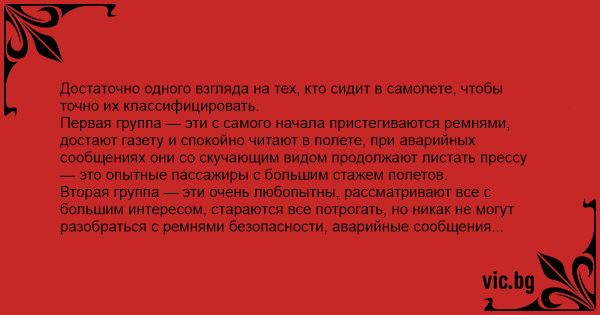 Первая группа — эти с самого начала пристегиваются ремнями, достают газету и спокойно читают в полете, при аварийных сообщениях они со скучающим видом продолжают листать прессу — это опытные пассажиры с большим стажем полетов.