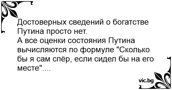 А все оценки состояния Путина вычисляются по формуле "Сколько бы я сам спёр, если сидел бы на его месте"....