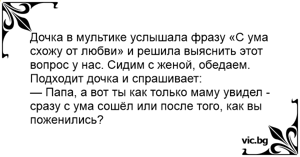 Дочка в мультике услышала фразу «С ума схожу от любви» и решила выяснить этот вопрос у нас. Сидим с женой, обедаем. Подходит дочка и спрашивает:
