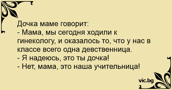 Žákyně deváté třídy přijde domů ze školy a povídá mamince: „Dnes jsme byly na gynekologické prohlídce.” „No a?” „V celé třídě je už jen jedna panna!” „Doufám, že jsi to ty!” „Ne, paní učitelka!”