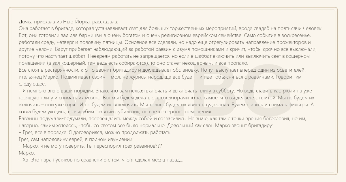 Дочка приехала из Нью-Йорка, рассказала. Она работает в бригаде, которая устанавливает свет для больших торжественных мероприятий, вроде свадеб на полтысячи человек. Вот, они готовили зал для бармицвы в очень богатом и очень религиозном еврейском семействе. Само событие в воскресенье, работали среду, четверг и половину пятницы. Основное все сделали, но надо еще отрегулировать направление прожекторов и другие мелочи. Вдруг прибегает наблюдающий за работой раввин с двумя помощниками и кричит, чтобы срочно все выключали, потому что наступает шаббат. Неевреям работать не запрещается, но если в шаббат включить или выключить свет в кошерном помещении (а зал кошерный, там ведь есть собираются), то оно станет некошерным, и все пропало. Все стоят в растерянности, кто-то звонит бригадиру и докладывает обстановку. Но тут выступает вперед один из осветителей, итальянец Марко. Подмигивает своим – мол, не журись, народ, ща все будет – и идет объясняться с раввинами. Говорит им следующее: – Я немного знаю ваши порядки. Знаю, что вам нельзя включать и выключать плиту в субботу. Но ведь ставить кастрюли на уже горящую плиту и снимать их можно. Вот мы будем делать с прожекторами то же самое, что вы делаете с плитой. Мы не будем их включать – они уже горят. И не будем их выключать. Мы только будем их двигать туда-сюда. Будем ставить и снимать фильтры. А когда будем уходить, то вырубим главный рубильник, он вне кошерного помещения. Раввины подумали-подумали, посовещались между собой и согласились. Не знаю, как там с точки зрения богословия, но им, наверно, самим хотелось, чтобы со светом все было нормально. Довольный как слон Марко звонит бригадиру: – Грег, все в порядке. Я договорился, можно продолжать работать. Грег, сам наполовину еврей, в полном изумлении: – Марко, я не могу поверить. Ты переспорил трех раввинов??? Марко: – Ха! Это пара пустяков по сравнению с тем, что я сделал месяц назад. – А что ты сделал? – Выбил из тебя сверхурочные.