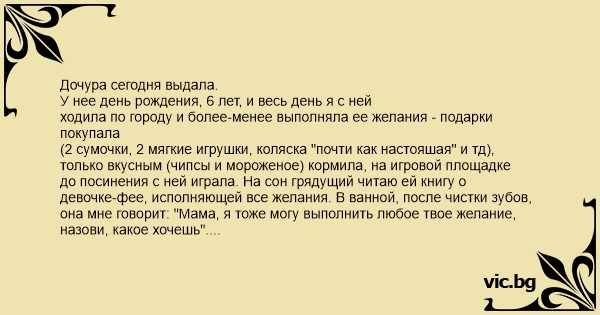У нее день рождения, 6 лет, и весь день я с ней ходила по городу и более-менее выполняла ее желания - подарки покупала (2 сумочки, 2 мягкие игрушки, коляска "почти как настояшая" и тд), только вкусным (чипсы и мороженое) кормила, на игровой площадке до посинения с ней играла. На сон грядущий читаю ей книгу о девочке-фее, исполняющей все желания. В ванной, после чистки зубов, она мне говорит: "Мама, я тоже могу выполнить любое твое желание, назови, какое хочешь". Я с ответом замялась, а она, глядя на меня, уставшую, шепчет: "Все, поняла, быстро иду спать".