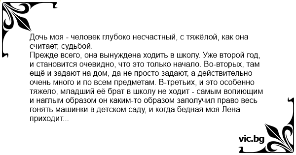 Дочь моя - человек глубоко несчастный, с тяжёлой, как она считает, судьбой.