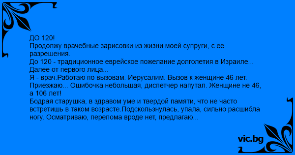 Я - врач.Работаю по вызовам. Иерусалим. Вызов к женщине 46 лет. Приезжаю... Ошибочка небольшая, диспетчер напутал. Женщине не 46, а 106 лет!