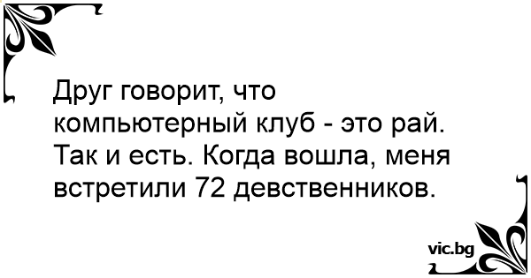 Приятелката ми вика, че в компютърния клуб е просто рай. Оказа се права. Влизам и виждам 72 девственика за мен....