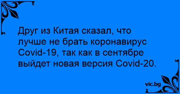 Друг из Китая сказал, что лучше не брать коронавирус Covid-19, так как в сентябре выйдет новая версия Covid-20.