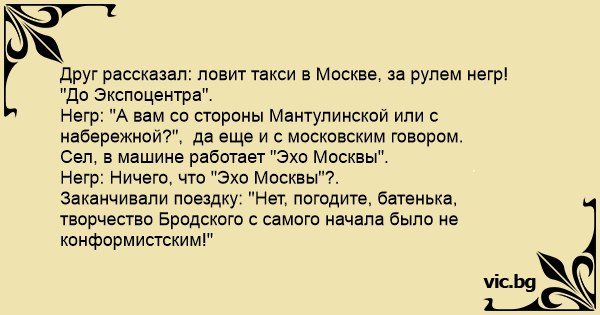 Друг рассказал: ловит такси в Москве, за рулем нeгp! "До Экспоцентра". Негр: "А вам со стороны Мантулинской или с набережной?", да еще и с московским говором. Сел, в машине работает "Эхо Москвы". Негр: Ничего, что "Эхо Москвы"?. Заканчивали поездку: "Нет, погодите, батенька, творчество Бродского с самого начала было не конформистским!"
