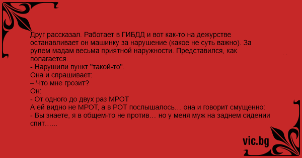 Друг рассказал. Работает в ГИБДД и вот как-то на дежурстве останавливает он машинку за нарушение (какое не суть важно). За рулем мадам весьма приятной наружности. Представился, как полагается.