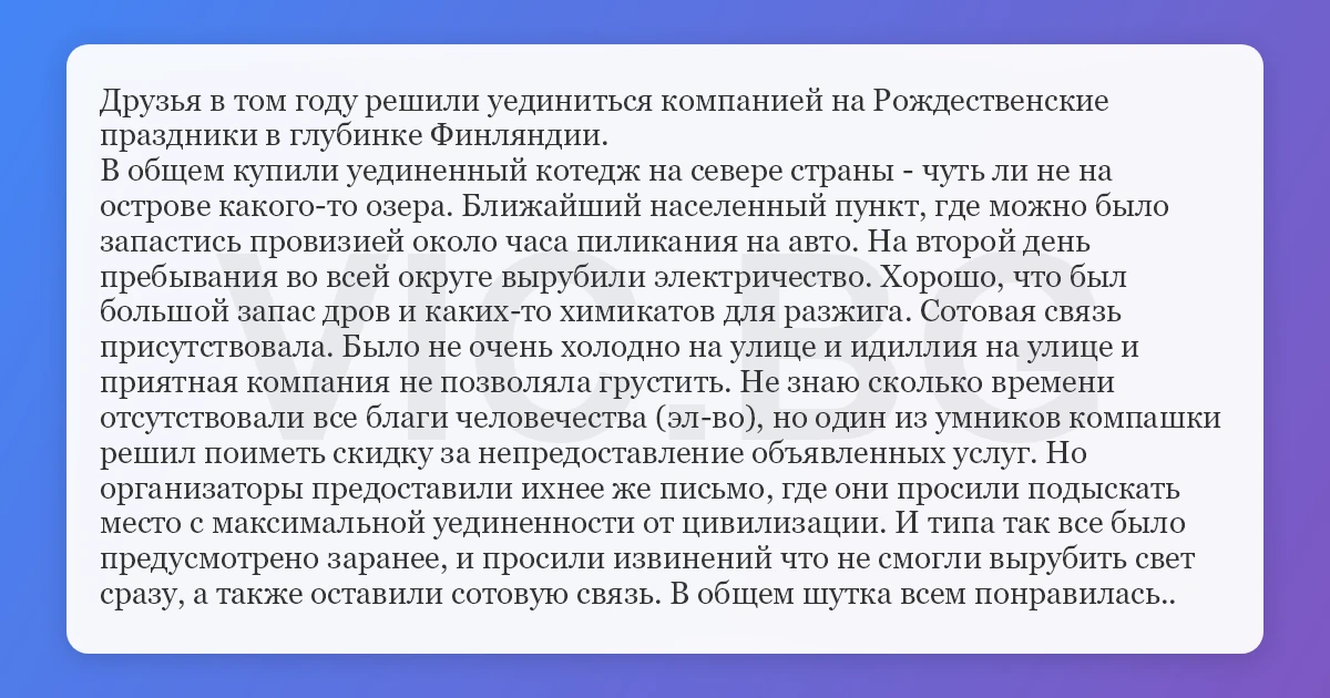 Друзья в том году решили уединиться компанией на Рождественские праздники в глубинке Финляндии. В общем купили уединенный котедж на севере страны - чуть ли не на острове какого-то озера. Ближайший населенный пункт, где можно было запастись провизией около часа пиликания на авто. На второй день пребывания во всей округе вырубили электричество. Хорошо, что был большой запас дров и каких-то химикатов для разжига. Сотовая связь присутствовала. Было не очень холодно на улице и идиллия на улице и приятная компания не позволяла грустить. Не знаю сколько времени отсутствовали все благи человечества (эл-во), но один из умников компашки решил поиметь скидку за непредоставление объявленных услуг. Но организаторы предоставили ихнее же письмо, где они просили подыскать место с максимальной уединенности от цивилизации. И типа так все было предусмотрено заранее, и просили извинений что не смогли вырубить свет сразу, а также оставили сотовую связь. В общем шутка всем понравилась..