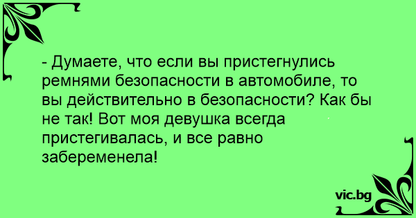 - Думаете, что если вы пристегнулись ремнями безопасности в автомобиле, то вы действительно в безопасности? Как бы не так! Вот моя девушка всегда пристегивалась, и все равно забеременела!