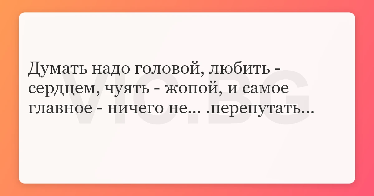 Думать надо головой, любить - сердцем, чуять - жопой, и самое главное - ничего не... .перепутать...