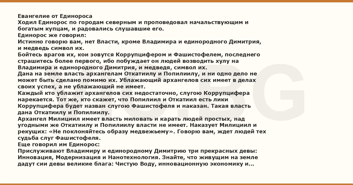 Евангелие от Единороса Ходил Единорос по городам северным и проповедовал начальствующим и богатым купцам, и радовались слушавшие его. Единорос же говорил: Истинно говорю вам, нет Власти, кроме Владимира и единородного Димитрия, и медведь символ их. Бойтесь врагов их, кои зовутся Коррупцифером и Фашистофелем, последнего страшитесь более первого, ибо побуждает он людей возводить хулу на Владимира и единородного Димитрия, и медведя, символ их. Дана на земле власть архангелам Откатиилу и Попилиилу, и ни одно дело не может быть сделано помимо их. Ублажающий архангелов сих имеет в делах своих успех, а не ублажающий не имеет. Каждый кто ублажит архангелов сих недостаточно, слугою Коррупцифера нарекается. Тот же, кто скажет, что Попилиил и Откатиил есть лики Коррупцифера будет назван слугою Фашистофеля и наказан. Такая власть дана Откатиилу и Попилиилу. Архангел Милициил имеет власть миловать и карать людей простых, над угодными же Откатиилу и Попилиилу власти не имеет. Наказует Милициил и рекущих: «Не поклоняйтесь образу медвежьему». Говорю вам, ждет людей тех судьба слуг Фашистофеля. Еще говорил им Единорос: Прислуживают Владимиру и единородному Димитрию три прекрасных девы: Инновация, Модернизация и Нанотехнология. Знайте, что живущим на земле дадут сии девы великие блага: Чистую Воду, инновационную экономику и победу на Олимпийских Играх. Сказка ложь, да в ней намек..