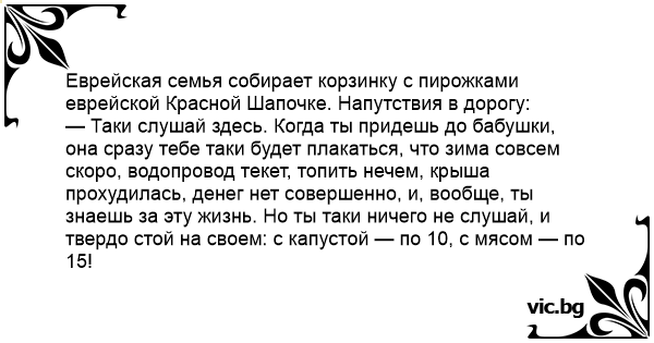 — Таки слушай здесь. Когда ты придешь до бабушки, она сразу тебе таки будет плакаться, что зима совсем скоро, водопровод текет, топить нечем, крыша прохудилась, денег нет совершенно, и, вообще, ты знаешь за эту жизнь. Но ты таки ничего не слушай, и твердо стой на своем: с капустой — по 10, с мясом — по 15!