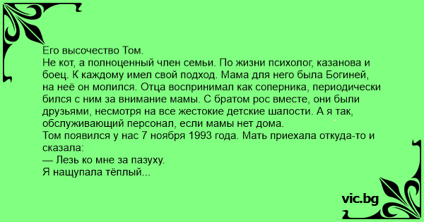 Не кот, а полноценный члeн семьи. По жизни психолог, казанова и боец. К каждому имел свой подход. Мама для него была Богиней, на неё он молился. Отца воспринимал как соперника, периодически бился с ним за внимание мамы. С братом рос вместе, они были друзьями, несмотря на все жестокие детские шалости. А я так, обслуживающий персонал, если мамы нет дома.