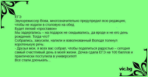 ЕГЭ Звукорежиссер Вова, многозначительно предупредил всю редакцию, чтобы не ходили в столовую на обед.