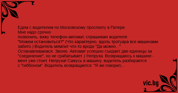 Едем с водителем по Московскому проспекту в Питере. Мне надо срочно позвонить, вижу телефон-автомат, спрашиваю водителя: "Можем остановиться?" (Что характерно, вдоль тротуара все машинами забито.) Водитель мямлит что-то вроде "Да можно..." Останавливаемся. Звоню. Автомат успешно съедает две единицы за "соединение", но не срабатывает.:( Непруха. Возвращаюсь к машине - мент уже стоит. Непруха! Сажусь в машину, водитель разбирается с "гиббоном". Водитель возвращается: "Я же говорил, нельзя здесь..." :(( Я: - Ну что, денег дать? Водитель: - Да не надо. (Дальше с его слов) Он, говорит, с вас 42 рубля. А я ему "Да у меня нету столько!" (а машина, кстати, 99-ая тонированная) "Вот, есть мелочью рублей 20" Гаишник(обиженно): "Да что я, Буратино, что ли?!"