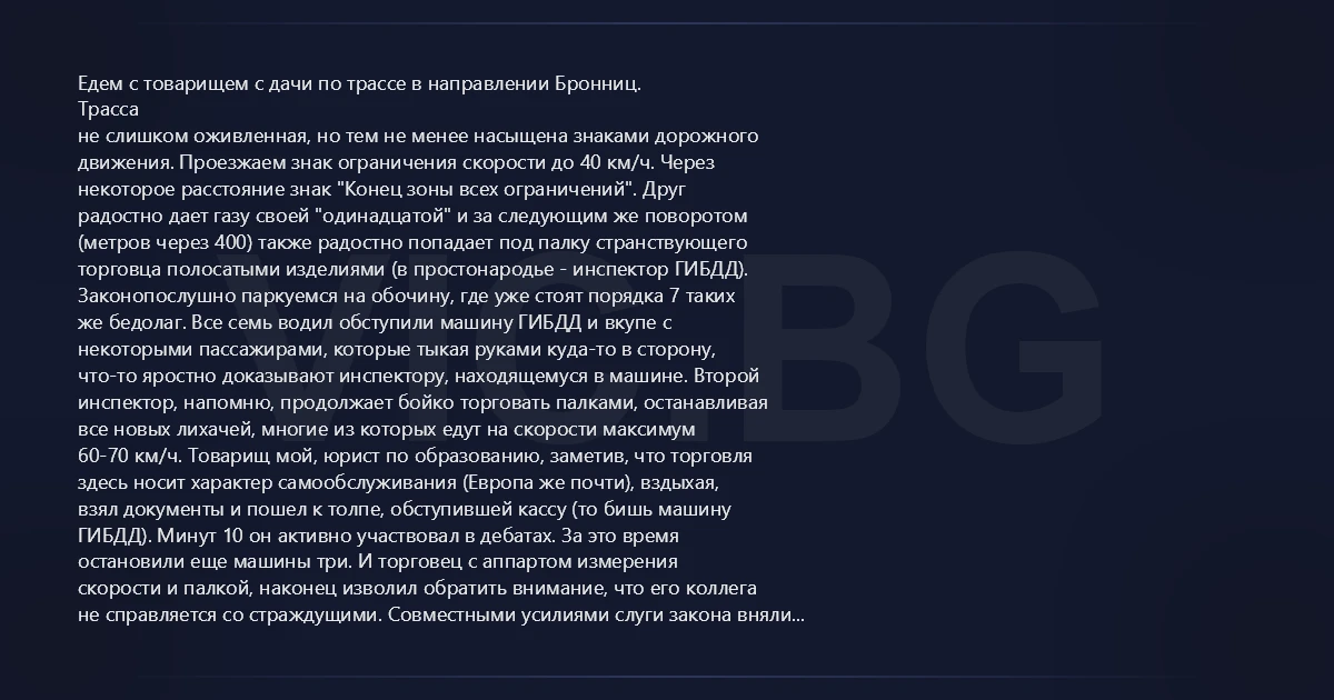 Едем с товарищем с дачи по трассе в направлении Бронниц. Трасса не слишком оживленная, но тем не менее насыщена знаками дорожного движения. Проезжаем знак ограничения скорости до 40 км/ч. Через некоторое расстояние знак "Конец зоны всех ограничений". Друг радостно дает газу своей "одинадцатой" и за следующим же поворотом (метров через 400) также радостно попадает под палку странствующего торговца полосатыми изделиями (в простонародье - инспектор ГИБДД). Законопослушно паркуемся на обочину, где уже стоят порядка 7 таких же бедолаг. Все семь водил обступили машину ГИБДД и вкупе с некоторыми пассажирами, которые тыкая руками куда-то в сторону, что-то яростно доказывают инспектору, находящемуся в машине. Второй инспектор, напомню, продолжает бойко торговать палками, останавливая все новых лихачей, многие из которых едут на скорости максимум 60-70 км/ч. Товарищ мой, юрист по образованию, заметив, что торговля здесь носит характер самообслуживания (Европа же почти), вздыхая, взял документы и пошел к толпе, обступившей кассу (то бишь машину ГИБДД). Минут 10 он активно участвовал в дебатах. За это время остановили еще машины три. И торговец с аппартом измерения скорости и палкой, наконец изволил обратить внимание, что его коллега не справляется со страждущими. Совместными усилиями слуги закона вняли словам граждан и обратили свои взоры в ту сторону, куда они тыкали пальцами... В метрах 100 от того места, где расположился нестационарный пост ГИБДД, дальше по дороге, ведущей в Бронницы сиротливо висел все тот же знак "Конец зоны всех ограничений"... Напомню подобный же висел как раз за тем поворотом, из-за которого мы появились... Почесав репу от недоумения, один инспектор собрал документы автолюбителей, а второй сел в машину и проехал за поворот... Через пять минут вернулся, проехал мимо места скопления автомобилей, доехал до второго знака, вылез из машины и... правильно, снял со столба знак "Конец зоны всех ограничений" и положил его в багажник. Толпа безмолвствует... Нужно отдать должное соломонову решению оставшегося гайца, он молча раздал водителям документы и отошел в сторонку... Водители радостно разъехались. Уехали и мы с другом... А вот сотрудники ГИБДД так и остались на означенном месте... может до сих пор там стоят?)