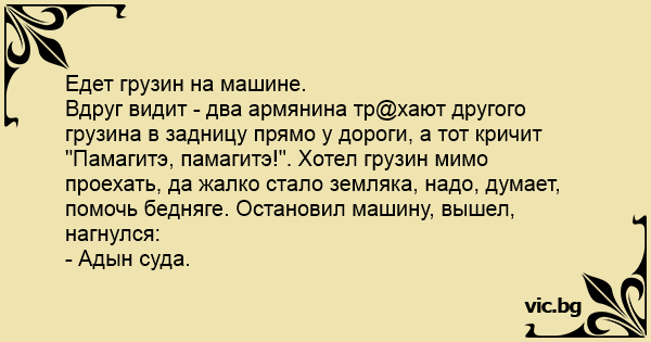 Вдруг видит - два армянина тр@хают другого грузина в задницу прямо у дороги, а тот кричит "Памагитэ, памагитэ!". Хотел грузин мимо проехать, да жалко стало земляка, надо, думает, помочь бедняге. Остановил машину, вышел, нагнулся: