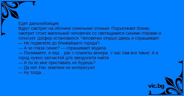 Вдруг смотрит-на обочине синенькие огоньки. Подъезжает ближе, смотрит стоит маленький человечек со светящимися синими глазами и голосует. Шофер остановился. Человечек открыл дверь и спрашивает: