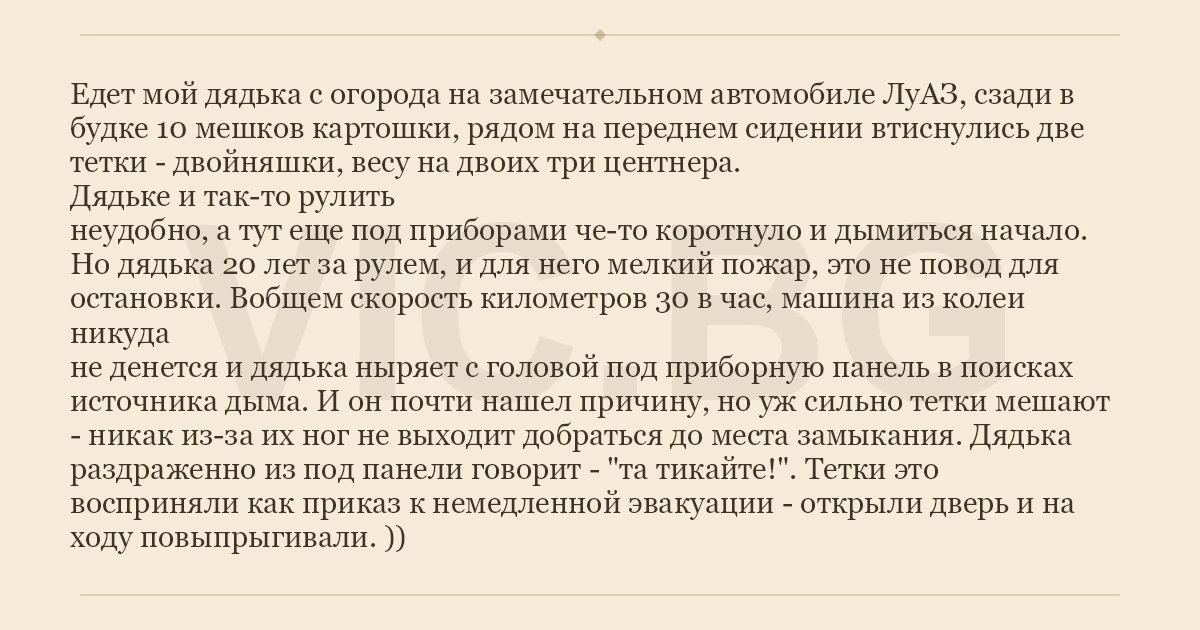 Едет мой дядька с огорода на замечательном автомобиле ЛуАЗ, сзади в