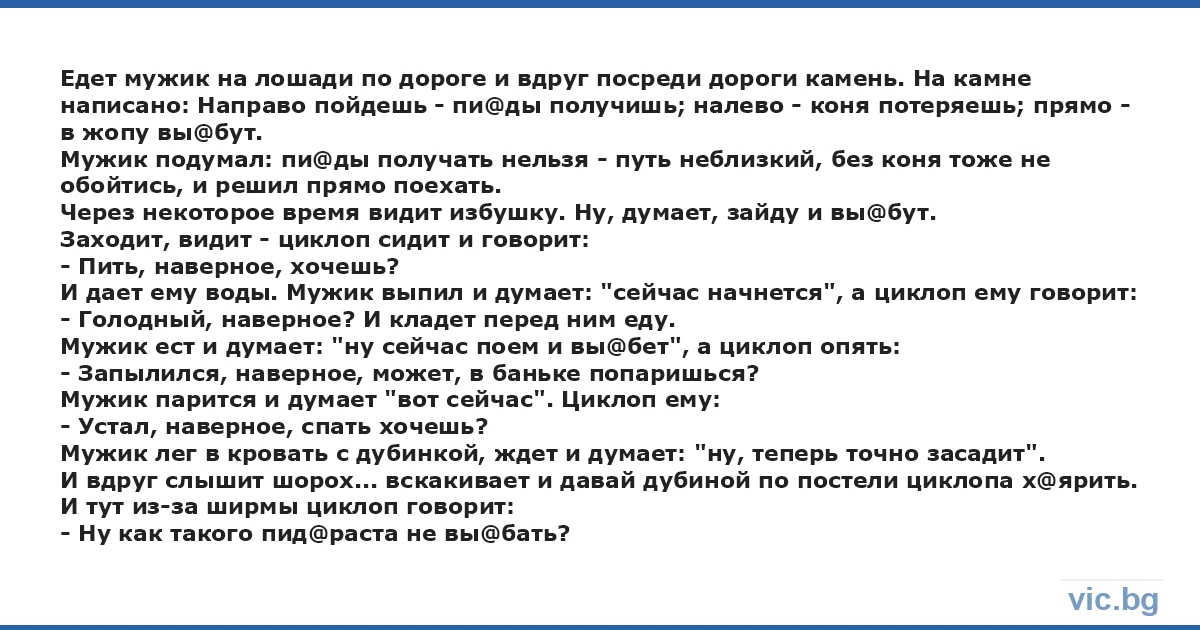 Едет мужик на лошади по дороге и вдруг посреди дороги камень. На камне написано: Направо пойдешь - пи@ды получишь; налево - коня потеряешь; прямо - в жопу вы@бут.