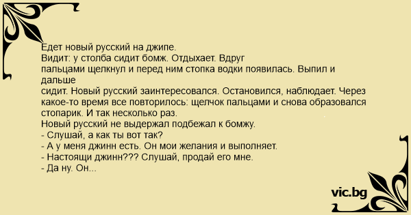 Новый русский потер лампу. Оттуда со свистом вылетел джинн: