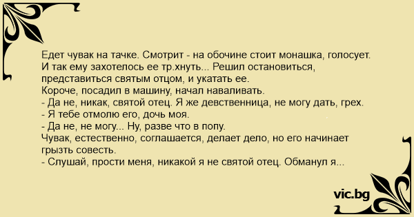 Едет чувак на тачке. Смотрит - на обочине стоит монашка, голосует. И так ему захотелось ее тр.хнуть... Решил остановиться, представиться святым отцом, и укатать ее.
