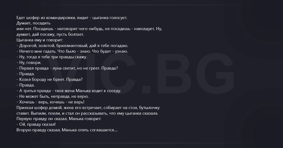 Едет шофер из командировки, видит - цыганка голосует. Думает, посадить или нет. Посадишь - наговорит чего-нибудь, не посадишь - наколдует. Ну, думает, дай посажу, пусть болтает. Цыганка ему и говорит: - Дорогой, золотой, бриллиантовый, дай я тебе погадаю. - Нечего мне гадать. Что было - знаю. Что будет - узнаю. - Ну, тогда я тебе три правды скажу. - Ну, говори. - Первая правда - луна светит, но не греет. Правда? - Правда. - Козел бороду не бреет. Правда? - Правда. - А третья правда - твоя жена Манька ходит к соседу. - Не может быть, неправда, не верю. - Хочешь - верь, хочешь - не верь! Приехал шофер домой, жена его встречает, собирает на стол, бутылочку ставит. Выпили, поели, и стал он рассказывать, что ему цыганка сказала. Первую правду он сказал, Манька говорит: - Ой, правду сказал! Вторую правду сказал, Манька опять соглашается. - А третью правду я тебе, Манька, не скажу. Она к нему пристала: скажи да скажи. Он и говорит: - А третья правда - у соседа Ваньки во-о-от такой малюсенький. - Ну уж это неправда!