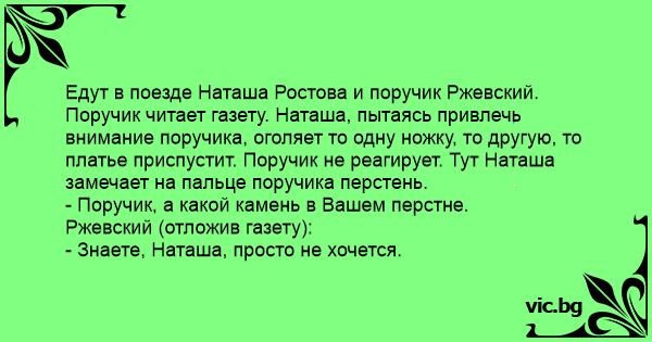Едут в поезде Наташа Ростова и поручик Ржевский. Поручик читает газету. Наташа, пытаясь привлечь внимание поручика, оголяет то одну ножку, то другую, то платье приспустит. Поручик не реагирует. Тут Наташа замечает на пальце поручика перстень.
