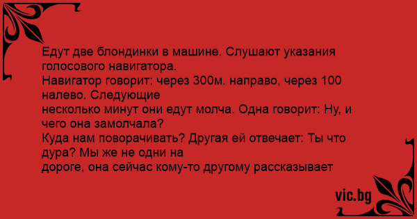 Куда нам поворачивать? Другая ей отвечает: Ты что дура? Мы же не одни на