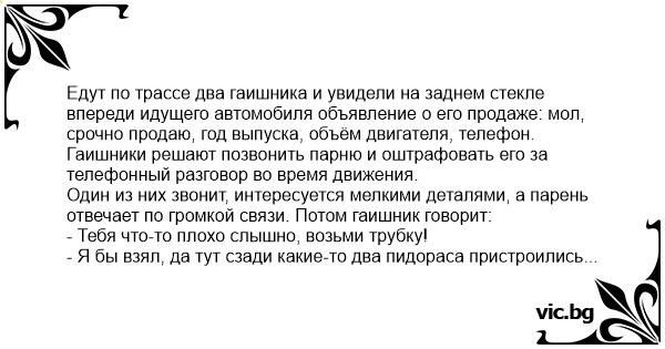 Едут по трассе два гаишника и увидели на заднем стекле впереди идущего автомобиля объявление о его продаже: мол, срочно продаю, год выпуска, объём двигателя, телефон.
