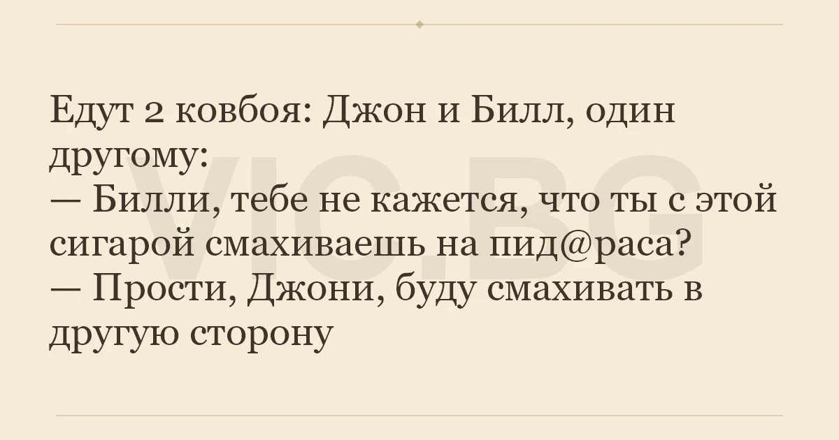 Едут 2 ковбоя: Джон и Билл, один другому: — Билли, тебе не кажется, что ты с этой сигарой смахиваешь на пид@раса? — Прости, Джони, буду смахивать в другую сторону