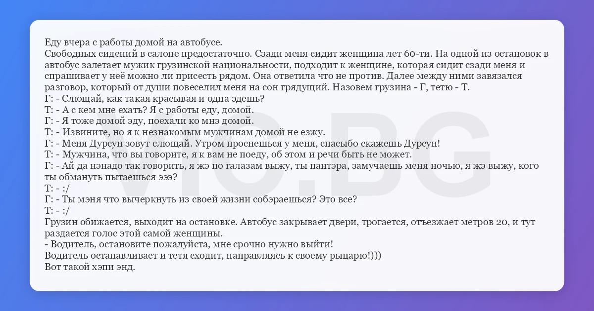 Свободных сидений в салоне предостаточно. Сзади меня сидит женщина лет 60-ти. На одной из остановок в автобус залетает мужик грузинской национальности, подходит к женщине, которая сидит сзади меня и спрашивает у неё можно ли присесть рядом. Она ответила что не против. Далее между ними завязался разговор, который от души повеселил меня на сон грядущий. Назовем грузина - Г, тетю - Т.