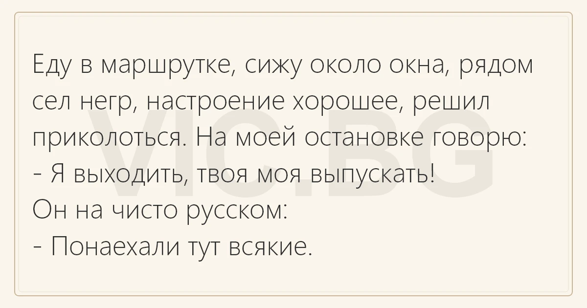 Еду в маршрутке, сижу около окна, рядом сел нeгp, настроение хорошее, решил приколоться. На моей остановке говорю:<br />- Я выходить, твоя моя выпускать!<br />Он на чисто русском:<br />- Понаехали тут всякие.