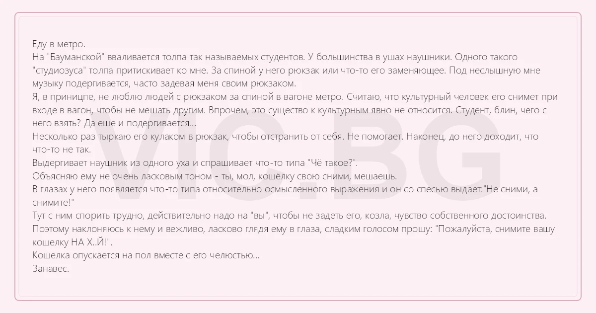 Еду в метро. На "Бауманской" вваливается толпа так называемых студентов. У большинства в ушах наушники. Одного такого "студиозуса" толпа притискивает ко мне. За спиной у него рюкзак или что-то его заменяющее. Под неслышную мне музыку подергивается, часто задевая меня своим рюкзаком. Я, в приницпе, не люблю людей с рюкзаком за спиной в вагоне метро. Считаю, что культурный человек его снимет при входе в вагон, чтобы не мешать другим. Впрочем, это существо к культурным явно не относится. Студент, блин, чего с него взять? Да еще и подергивается... Несколько раз тыркаю его кулаком в рюкзак, чтобы отстранить от себя. Не помогает. Наконец, до него доходит, что что-то не так. Выдергивает наушник из одного уха и спрашивает что-то типа "Чё такое?". Объясняю ему не очень ласковым тоном - ты, мол, кошёлку свою сними, мешаешь. В глазах у него появляется что-то типа относительно осмысленного выражения и он со спесью выдает:"Не сними, а снимите!" Тут с ним спорить трудно, действительно надо на "вы", чтобы не задеть его, козла, чувство собственного достоинства. Поэтому наклоняюсь к нему и вежливо, ласково глядя ему в глаза, сладким голосом прошу: "Пожалуйста, снимите вашу кошелку НА Х..Й!". Кошелка опускается на пол вместе с его челюстью... Занавес.